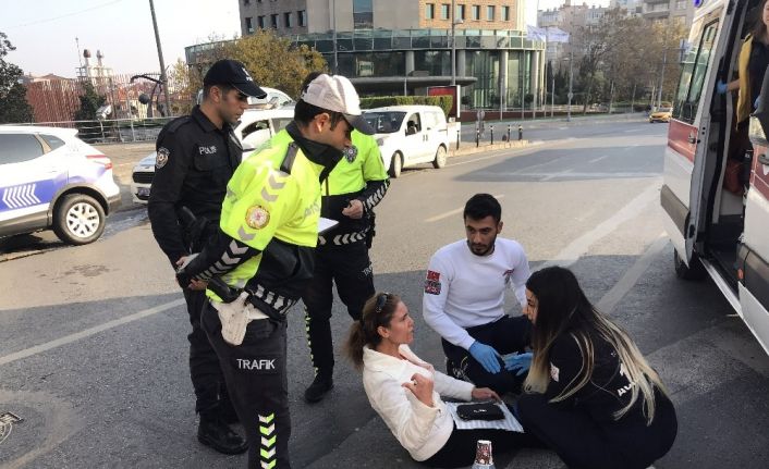 Levent’te yol ayrımına geldiği esnada aniden şerit değiştiren sürücünün idaresindeki otomobile, motosiklet çarptı. Çarpmanın etkisiyle motosikletin üzerindeki çift yere savrulurken, ayağından ve elinden yaralanan kadın çaresizce yerde ambulans bekledi.
