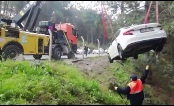 Maltepe’de kontrolden çıkan otomobil yoldan çıkarak ormanlık alana uçtu. Ormandaki ağaçlara çarparak duran otomobilde bulunan 2 kişi ise yaralandı.