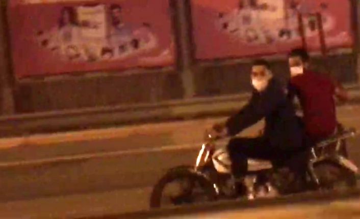 E-5 karayolu Kadıköy mevki’inde plakasız bir motosiklet ile tehlikeli şekilde yolculuk yapan 2 kişi yürekleri ağza getirdi. Korona virüse karşı önlem amacıyla maske takan şahıslar, kask takmayarak canlarını hiçe saydı. Tehlikeli motosiklet yolculuğu başka bir sürücünün cep telefonu kamerasına yansıdı.