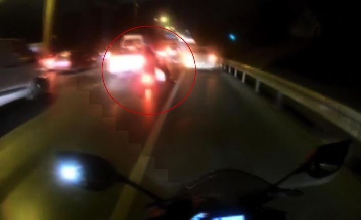 Aksaray’da meydana gelen diğer kazada ise motosikletli sürücü trafikte seyrettiği esnada bir kişi bir anda yola atladı. Motosikletli, metrelerce uzaklıktan korna basarak uyarmasına rağmen yol ortasında kalan kişiye çarptı. Çarpmanın etkisiyle kısa bir süreliğine hakimiyetini kaybeden sürücü ardından yoluna devam etti. Kaza anı ise kask kamerasına yansıdı.