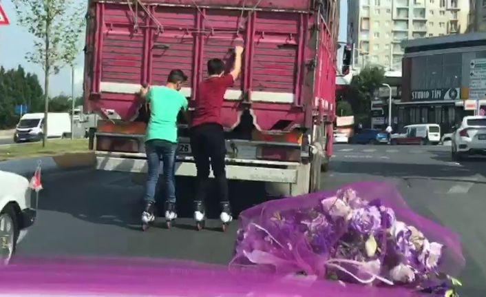 Kamyon arkasına asılarak hiçbir güvenlik önlemi almadan paten kayan 2 gencin yolculuğu görenlere pes dedirtti. Patenli gençlerin tehlikeli yolculuğunu mutluluğa evet demeye giderken gören çift, gelin arabasından cep telefonuyla görüntüledi.