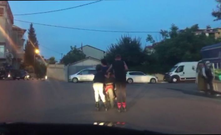 Sultanbeyli’de dün akşam saatlerinde, 2 patenci genç motosiklet üstündeki diğer 2 kişinin arkasına tutunarak seyahat etmeye başladı. Adrenalin arayan patenci gençlerin bu seyahati yürekleri ağza getirirken hem birbirleri ile şakalaştılar hem de video çektiler.