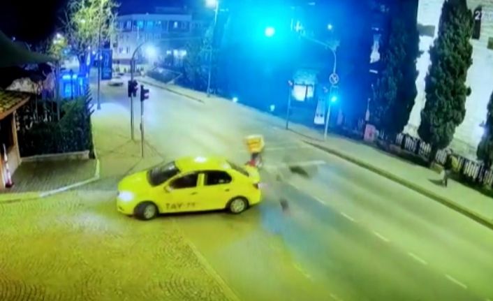 Beyoğlu’nda siparişi yetiştirmek üzere boş yolda sür’atli bir şekilde seyreden motosikletli kurye, sola dönüş yapan taksiye çarptı. Feci kaza kameralara yansırken, havada takla atarak yere savrulduktan sonra metrelerce sürüklenen kurye ve taksideki kadın yolcu yaralandı.