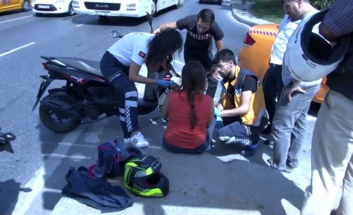 Beyoğlu Piyalepaşa Bulvarı üzerinde kavşaktan dönüş yapan taksi ile motosiklet çarpıştı. Çarpmanın etkisiyle taksinin ön camına düşerek yaralanan motosiklet sürücüsü kadın, ambulansla hastaneye kaldırıldı.
