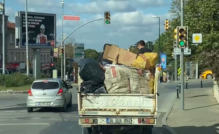 Üsküdar’da bir kamyonetin kasasında, yüklerin üzerinde korunaksız olarak seyahat eden iki kişi görenleri endişelendirdi. Kazaya davetiye çıkaran gençlerin rahat tavırları pes dedirtirken yaşanan o anlar ise vatandaşın cep telefonu kamerasına yansıdı.
