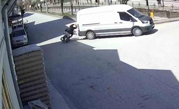 Kaza anı ise güvenlik kamerasına yansıdı. Görüntülerde motosikletin sola dönüş yapan minibüse arkadan çarptığı görülüyor. Çarpmanın etkisiyle savrulan motosiklet sürücüsü yere düşüyor.