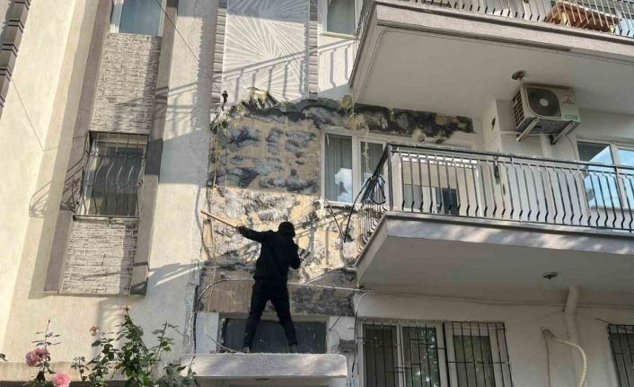 Aydın’ın Efeler ilçesinde 5 katlı bir apartmanın dış cephesini 15 günde yapan ustalar, iş sonunda paralarını alamadıkları iddiasıyla bir dairenin dış cephesini kısa sürede söküp parçaladılar.