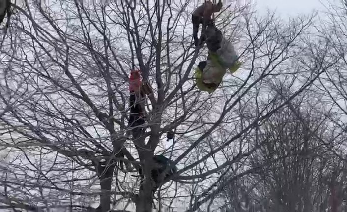 Öte yandan, şahsın paraşütle ormanlık alana düşme anı ise aksiyon kamerasına yansıdı. Vatandaşın kaskında bulunan aksiyon kamerasına yansıyan görüntülerde, vatandaş atlayış yaptıktan kısa süre sonra paraşütünün kapandığı ve düştüğü görülüyor. Ağacın tepesine düşen vatandaş mahsur kalıyor.