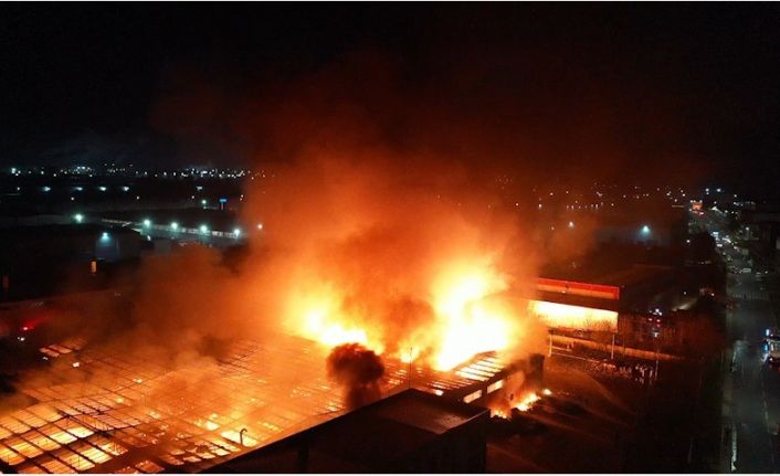 Parfüm depsunu saran yangın drone ile havadan da görüntülendi. Yangının etkisiyle fabrikanın duvarları, çatıları tamamen çökerken alevlerin arasında patlamalar halen devam ediyor.