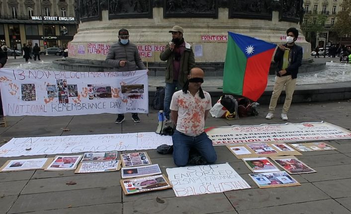 Fransa’nın başkenti Paris’te bulunan Republique (Cumhuriyet ) Meydanı, haftasonları Fransa’da yaşayan etkin grupların hak arama ve özgürlüğe kavuşma eylemlerine tanık oluyor. Meydanda farklı ülkelerin bünyesindeki etnik gruplar kendi bayraklarını açarak bölgelerinde yaşanan olumsuzlukları protesto ediyor. Son olarak, İran ve Pakistan arasında yer alan Belucistan bölgesinde yaşayanların maruz kaldığı olumsuzluklara dikkat çekmek için gösteri düzenlendi. İran ve Pakistan’ın Belucistan üzerindeki anlaşmazlığı nedeniyle bölge halkının yaşadığı olumsuzlukları dünyaya duyurmak isteyen bir gösterici ilginç bir yönteme başvurdu. Üzerinde kanı andıran kırmızı lekelerin yer aldığı bir tişört giyen gösterici, gözlerini siyah bir kumaş parçasıyla kapattı. Bir grup Beluç milliyetçisinin de bayrak açarak destek verdiği gösteri çevredekilerin ilgisini çekti.