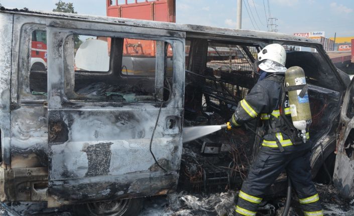 100 karayolu yan yolda park halindeki bir minibüs patlayarak alev topuna döndü. Alev alev yanan minibüs kullanılamaz hale gelirken, çevredekiler korku dolu anlar yaşadı.
