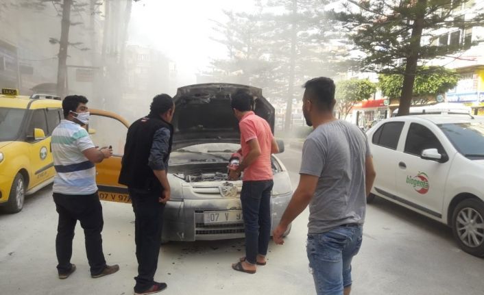 Antalya’da park halindeki taksi alev aldı. Çevredeki vatandaşların yangın tüpleriyle müdahale ettiği araç söndürüldü.