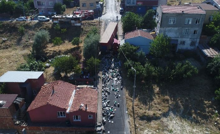 Tırın çarptığı evde büyük hasar meydana gelirken tır dorsesinde bulunan turşu dolu bidonlar da etrafa dağıldı. Olay yeri ve çevreye saçılan turşular havadan görüntülendi.