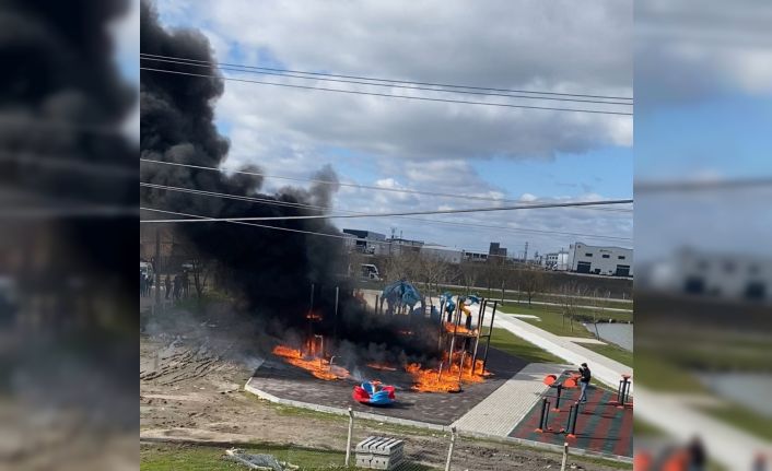 Tekirdağ’ın Ergene ilçesinde çocukların yaktığı ateş nedeniyle parktaki oyun grupları alev alev yandı.