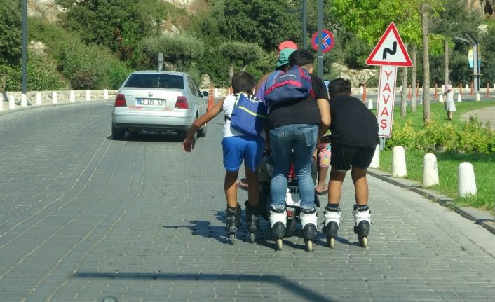 Olay, Konyaaltı sahilinden Konyaaltı Caddesi’ne çıkışın olduğu virajlı çift yönlü yolda meydana geldi. Sahilden arkasına bindirdiği yolcuyla gitmek için hazırlanan motosiklet sürücüsü, yokuşu çıkmak için yardım isteyen 3 patenli çocuğun motosikletine tutunmasına müsaade etti. Yaklaşık 250 metrelik mesafeyi motosiklete tutunarak giden çocuklar, zaman zaman düşme tehlikesi yaşadı. Yokuşu çıkan çocuklar ardından motosikletten ayrılıp yollarına paten sürerek devam etti.