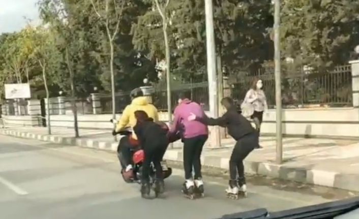 Manisa’da 6 patenli gencin iki ayrı motosiklete tutunarak yoğun trafik içinde seyretmesi tepkiye neden oldu. O anlar bir sürücü tarafından kaydedilirken patenli gençlerin rahat tavırları dikkat çekti.