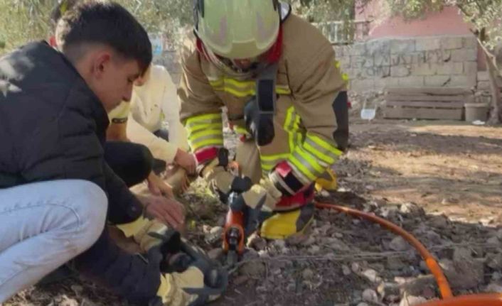 Hatay’da patisi zincire sıkışan köpeğin yardımına itfaiye yetişti.