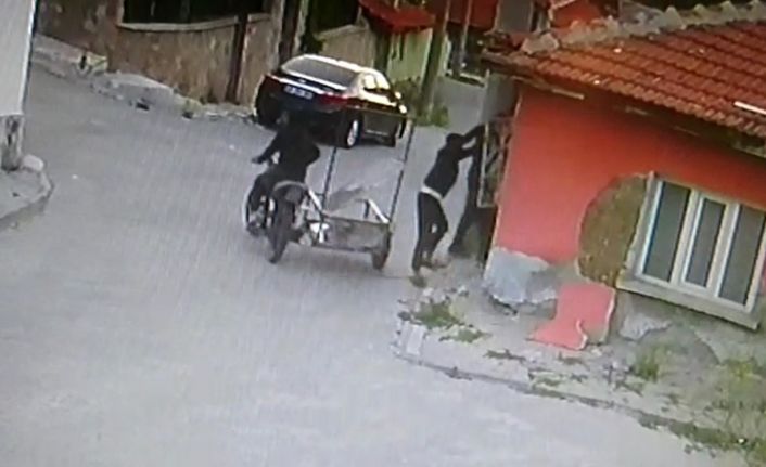 Eskişehir’de sepetli motosikletle bir evin önüne gelen 3 kişinin camdaki demir korkulukları çalmaları güvenlik kameralarına yansıdı.