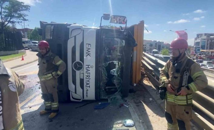 Pendik’te hafriyat kamyonu devrildi, kasadaki toprak başka bir araca döküldü