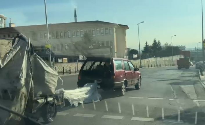 Pendik Dolayoba Mahallesinde yolda ilerlediği sırada motosikleti arıza yapan kağıt toplayıcısı yolda kaldı. Motosikleti arıza yapan kişinin yardımına koşanların bulduğu çare ise görenleri şaşırttı. Motosiklet ile bir otomobil naylon ile birbirlerine bağlandı. Otomobil sürücüsü, arkadan naylon ile bağladığı motosikleti yolda çekerek ilerletti. Bir kişi de otomobilin kapısı açık bagajında oturarak yolculuk etti.