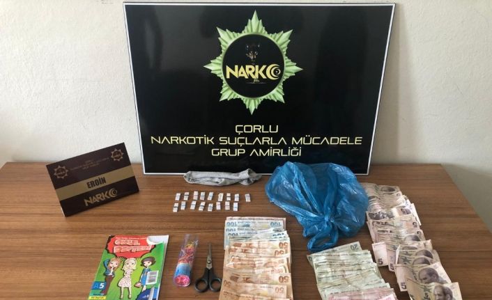 Yapılan aramalarda satışa hazır şekilde fişeklenmiş 17 fişek eroin maddesi, uyuşturucu madde satışından elde edildiği değerlendirilen 2 bin 655 TL para, uyuşturucu madde fişeklemesinde kullanılan makas, sayfaları yırtılmış defter ve renkli saç tokaları ele geçirildi.