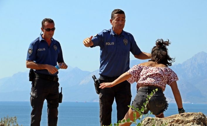 Antalya’da 30 metrelik falezlerin ucuna gelen alkollü genç kadın, polise zor anlar yaşattı. Falezlerin ucunda manzara seyretmek istediğini söyleyen kadına ekipler müsaade etmedi. Bir gazetecinin, ‘Polisler senin için endişeleniyor’ sözüne de genç kadın, ‘Ne kadar karizmatikler’ şeklinde cevap verdi.
