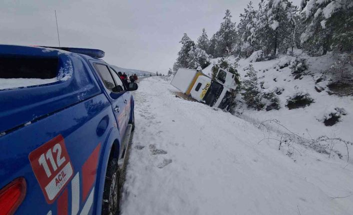 Karabük’te meydana gelen trafik kazasında PTT Kargoya ait kamyon buzlanan yolda kayarak karşı şeride geçip devrildi.