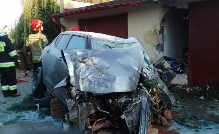 Polonya’da alkollü bir sürücünün kullandığı araç, kontrolden çıkıp refüje ardından metrelerce havalanarak bir evin duvarına çarptı. Aracın hurdaya döndüğü ve sürücünün yaralandığı kaza anı saniye saniye kameraya yansıdı.