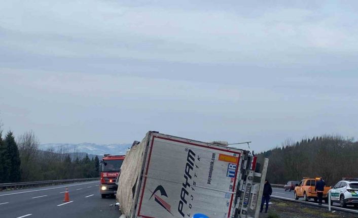 Anadolu Otoyolu Sakarya geçişinde kontrolden çıkarak refüje çarpıp yan yatan tırın sürücüsü yaralandı. Dorsedeki malzemeler otoyola saçıldı
