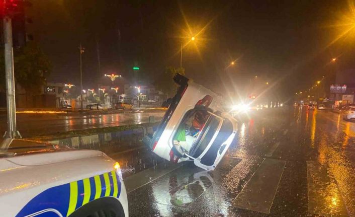Antalya’nın Serik ilçesinde kontrolden çıkan bir otomobilin refüje çarparak yan yatması sonucu meydana gelen kazada, sürücü ve yolcu yara almadan kurtuldu.
