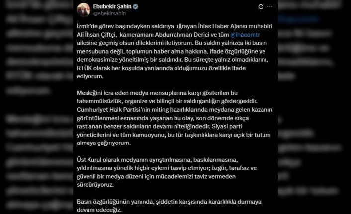 İzmir’de gerçekleşecek Cumhuriyet Halk Partisi (CHP) miting hazırlıklarında meydana gelen kazanın takibi için olay yerine giden İHA Muhabiri Ali İhsan Çiftçi ve Kameraman Abdurrahman Derici, miting bölgesinde bulunan 15-20 kişilik bir grubun saldırısına uğradı. Saldırının ardından olaya ilişkin RTÜK Başkanı Ebubekir Şahin, sosyal medya hesabından paylaşımda bulundu. Şahin açıklamasında, başlarından ve vücutlarının çeşitli yerlerinden yaralanan İHA ekibine geçmiş olsun dileklerini iletti.