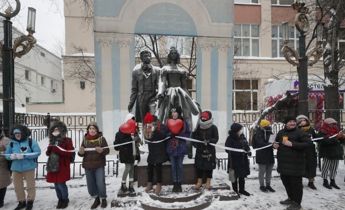 Rus muhalif lider Alexei Navalny’nin tutuklanmasının ardından Rusya Devlet Başkanı Vladimir Putin karşıtı gösteriler düzenleyen Navalny destekçileri, Sevgililer Günü’nde de sokakları boş bırakmadı.