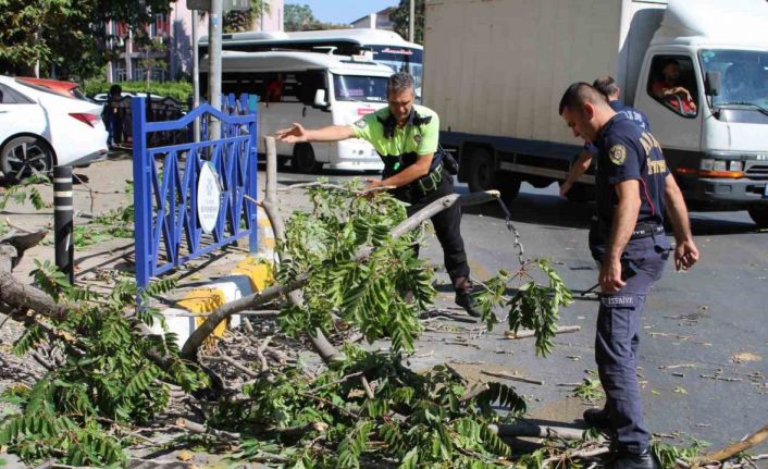 Koparak yola savrulan ağaç dallarını temizleyen itfaiye ve trafik ekipleri trafik güvenliğini sağlarken, bölgeye sevk edilen Aydın Büyükşehir Belediyesi personeli kopan ağaç dallarını testere ile keserek topladı.