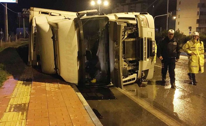 Mersin’in Erdemli ilçesinde sağanak yağış esnasında kontrolden çıkarak devrilen tırın sürücüsü yaralandı. Kaza anı bir iş yerinin güvenlik kamerasına anbean yansıdı.