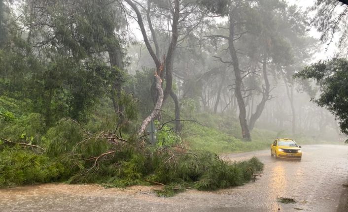 Antalya’nın merkez Aksu ilçesi sınırları içinde bulunan Kurşunlu Şelalesi yolu üzerinde şiddetli yağan yağmura dayanamayan ağaç kırılarak yola devrildi.