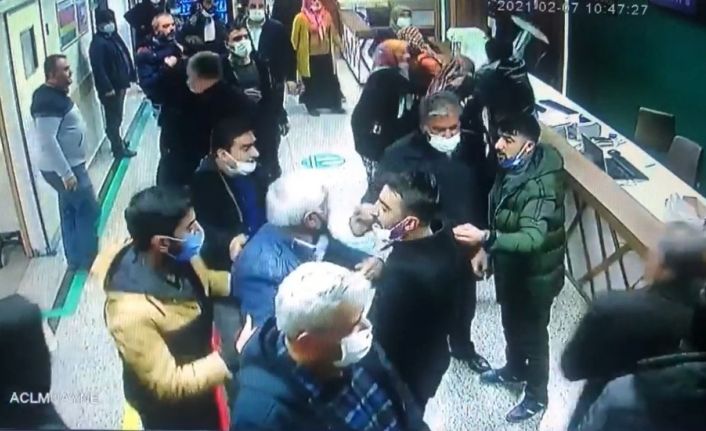 Sağlık çalışanlarına aile tarafından yapılan yumruklu, tekmeli saldırı hastanenin güvenlik kameralarına yansıdı.