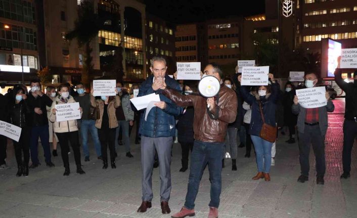 Sağlık çalışları adına açıklama yapan İbrahim Üslü, "Bugün burada Ondokuz Mayıs Üniversitesi sağlık işçileri olarak bizleri masada savunmak yerine haklarımızı veren Türkiye Sağlık İşçileri Sendikası’nı(Sağlık-İş) protesto etmek için toplandık. Bizler geç olsa da anladık. Bilmeden işveren sendikasına üye olmuşuz. Bunu da maalesef sözleşme imzalandıktan sonra anladık. Masada 20 yıllık sözleşme ile kazanılan hakları, bazı maddelerin içeriğini değiştirerek ve işveren yanlısı olarak biz sağlık işçilerini mağdur eden sendika ve sendikacıları kınıyoruz. Bizleri açlık sınırında maaş almaya mahkum eden sendika yöneticileri sizler ne kadar alıyorsunuz açıklar mısınız? Bizim aidatlarımızla maaş alıyorsunuz? ’İşçinin alın teri kurumadan hakkını verin’ diyen bir Peygamberimiz varken siz sendika olarak alın terimizi aldınız. Bizleri açlık sınırında maaş almaya mahkum ettiniz. Sizleri bu hatalarınızı telafi ederek işçinin yanında olduğunuzu göstermeye davet ediyoruz. Bu sendikanın genel merkez yöneticileri kendi şubelerine bağlı iş yerlerince 50 TL aidat alırken, OMÜ’de bizleri mağdur ettikleri halde her ay bizden en düşüğü 108 TL olan aidatları almaya devam ediyorlar. Bu nasıl bir zihniyettir? Biz sağlık çalışanları olarak açlık sınırında maaş almak istemiyoruz. ’Kamu çerçeve protokolü’, Çalışma sosyal Güvenlik Bakanımız Vedat Bilgin’in açıklamaları doğrultusunda bizlere de uygulanmalıdır. Sözleşme öncesi yüksek vaatler vererek bizleri üye yapan, ’4 bin 500 TL altında maaşa imza atmayız’ diyen sendika, sözleşme sonrası ortada yok. Haber alınamıyor, masada haklarımız verildi" dedi.