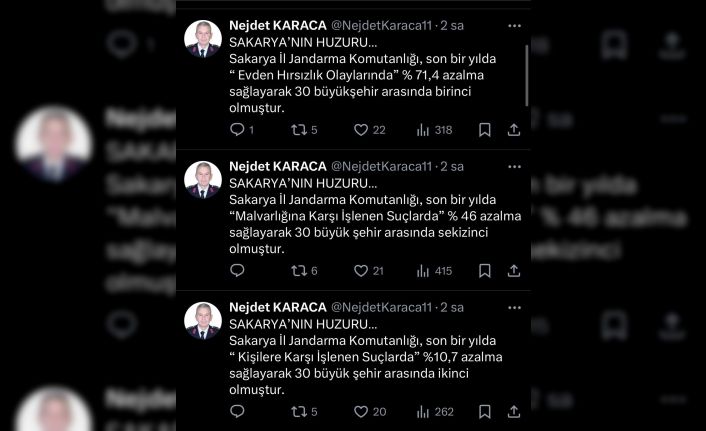Sakarya İl Jandarma Komutanı Nejdet Karaca, son bir yılda çeşitli suçların azalmasındaki yüzdelikleri ‘Sakarya’nın Huzuru’ başlığıyla sosyal medyada paylaştı. Verilere göre hırsızlık olaylarının büyük oranda azaldığı Sakarya, bu suçun düşüş oranına göre 30 büyükşehir arasında birinci oldu.