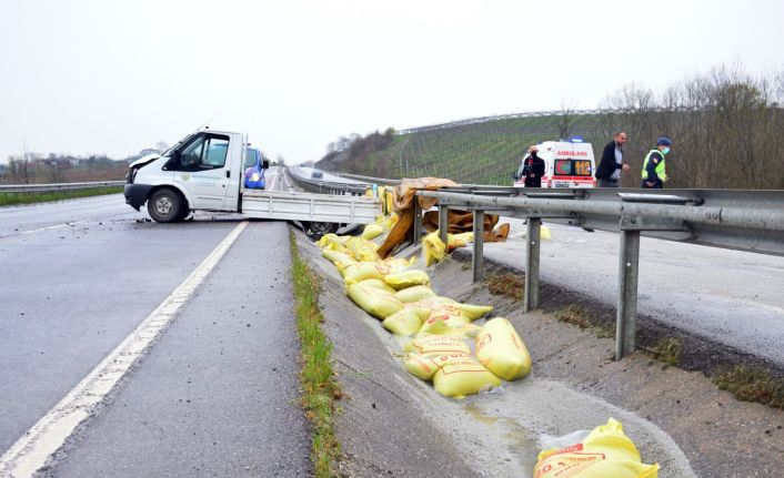 Sakarya’nın Karasu ilçesi D650 karayolunda gübre yüklü kamyonet bariyerlere çarptı. Araç sürücüsünün hafif yaralandığı kazada gübreler yola saçıldı.