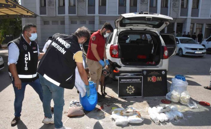 Mersin’de şüphe üzerine durdurulan bir araçta narkotik köpeği ’Brego’ vasıtasıyla yapılan aramada, salça ve peynir bidonları arasına gizlenmiş 7 kilo 580 gram esrar ele geçirildi.