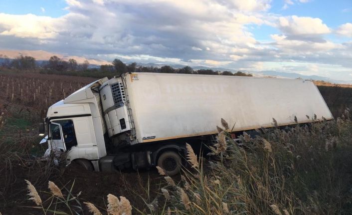 Manisa’nın Salihli ilçesinde yağan yağmurla birlikte kayganlaşan yolda sürücüsünün kontrolünden çıkan tır üzüm bağına girdi. Tır sürücüsü kazayı hafif sıyrıklarla atlattı.