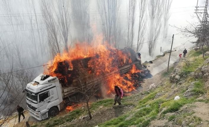Konya’nın Halkapınar ilçesinde seyir halindeyken alev alan saman balyası yüklü tır, çıkan yangın sonrası kullanılamaz hale geldi.