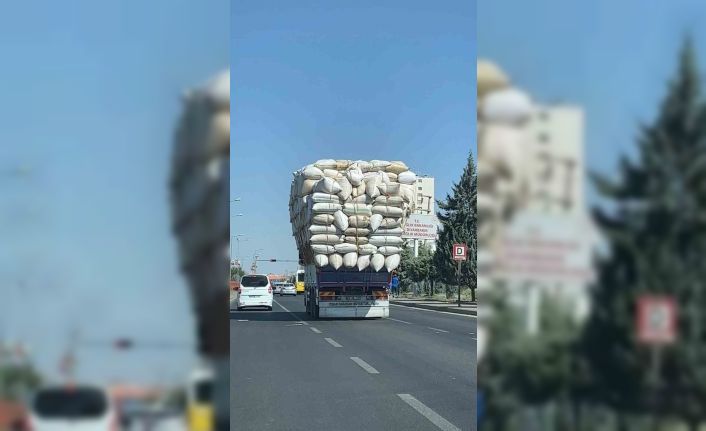 Diyarbakır’da aşırı yükü ve brandasız saman yüklü kamyon sürücüleri korkuttu. Trafiği tehlikeye atan kamyon, başka bir sürücü tarafından cep telefonu ile kaydedildi.