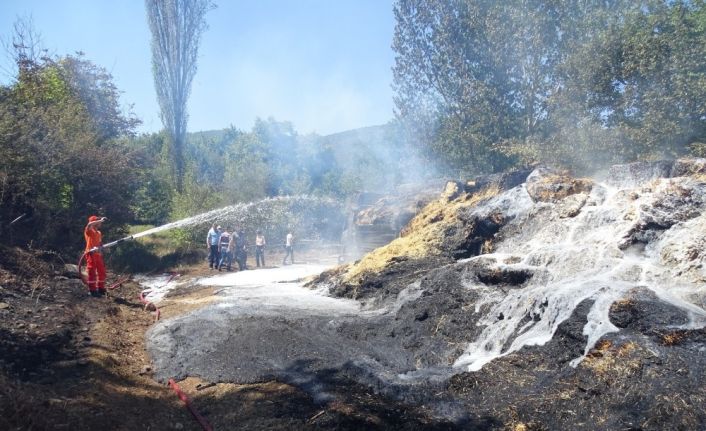 Yangın sonucu tır ve üzerindeki 610 saman balyası tamamen yanarken, jandarma yangınla ilgili soruşturma başlattı.
