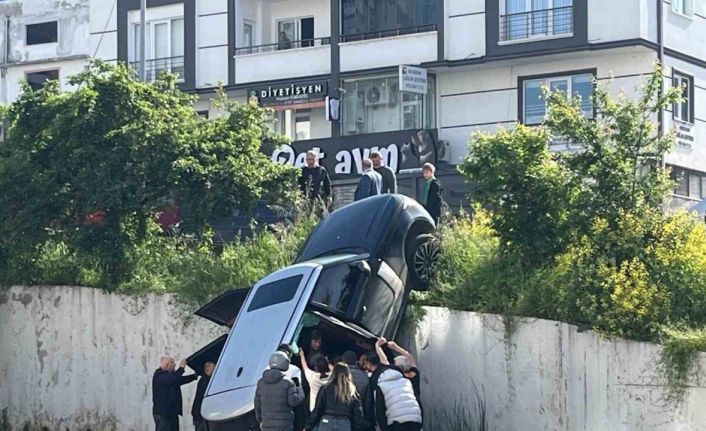Samsun’da rampa aşağı geri geri kaçan lüks cipin istinat duvarından düşerek asılı kaldığı kazada 2 kadın yaralandı.