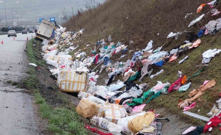 İstanbul’dan Gürcistan’a giysi taşıyan tır Samsun’da kaza yaptı, giysiler yola saçıldı.