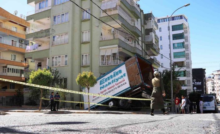 Şanlıurfa’da park halindeyken freni boşalan nakliye kamyonu, 6 katlı apartmanın duvarına çarptı.