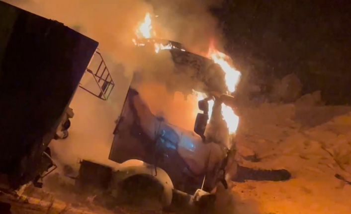 Kars’ın Sarıkamış ilçesinde hafif ticari araçla çarpışan tır, yoldan çıkarak yan yattı. Bir anda alev topuna dönen tırdan çıkan sürücü ise yanmaktan son anda kurtuldu.