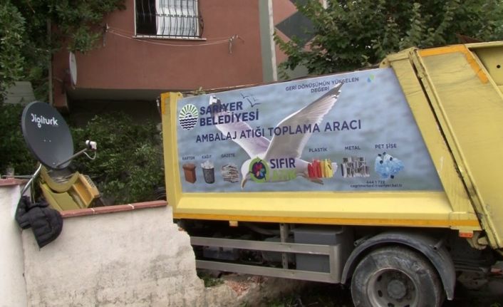 Sarıyer’de freni boşaldığı iddia edilen çöp kamyonu, ortalığı adeta savaş alanına çevirdi. Park halindeki araçlara çarparak sitenin duvarını aşan kamyon, karşıdaki binanın bahçesine girerek durabildi.