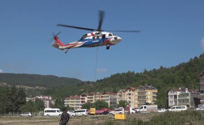 SİNOP (İHA) – Sel felaketi yaşanan Sinop’ta köylere helikopterle jeneratörler taşınıyor. Ekipler, helikopterlerle sel bölgelerine inerek elektrik arızalarını gidermek için yoğun mesai harcıyor.